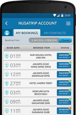 Đặt & So sánh ưu đãi chuyến bay giá rẻ. Tìm tất cả các vé máy bay khuyến mãi từ tất cả các hãng hàng không lớn ở Indonesia trong nước, Đông Nam Á và tất cả các hãng hàng không quốc tế . Mua vé điện tử với ứng dụng di động NusaTrip thật dễ dàng.